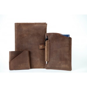 Set vintage format din produse piele: agenda 2016 inmbracata in husa din piele, portofel slim si husa piele pentru carnetel notite. Setul se mai poate adapta dupa preferintele dumneavoastra.